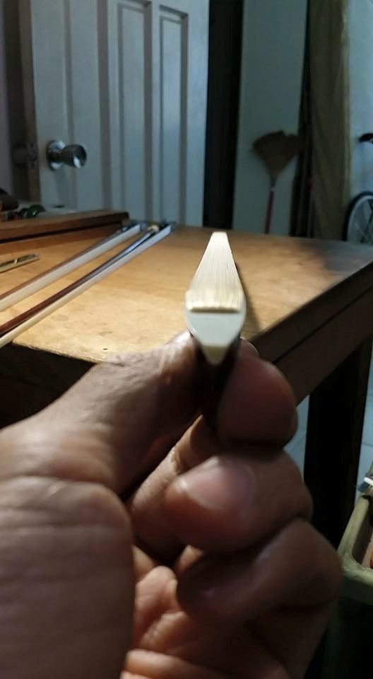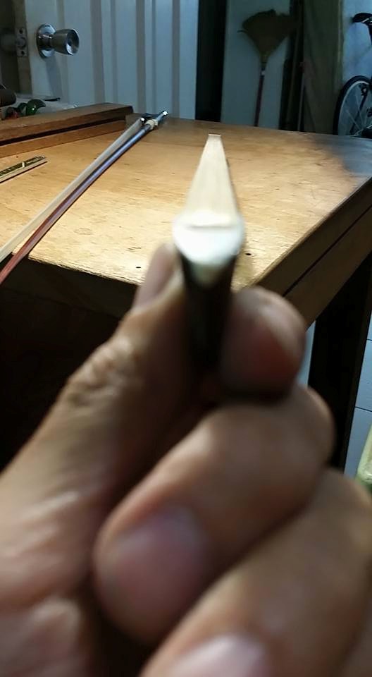 1.一把好弓的弓桿、Frog、Button必定緊密結合,先繃緊弓毛到你要拉琴的張力,然後觀察弓桿與Frog的間隙,能100%密合這是就把好弓,有翹起有間隙會左右搖晃那妳可以放下它。