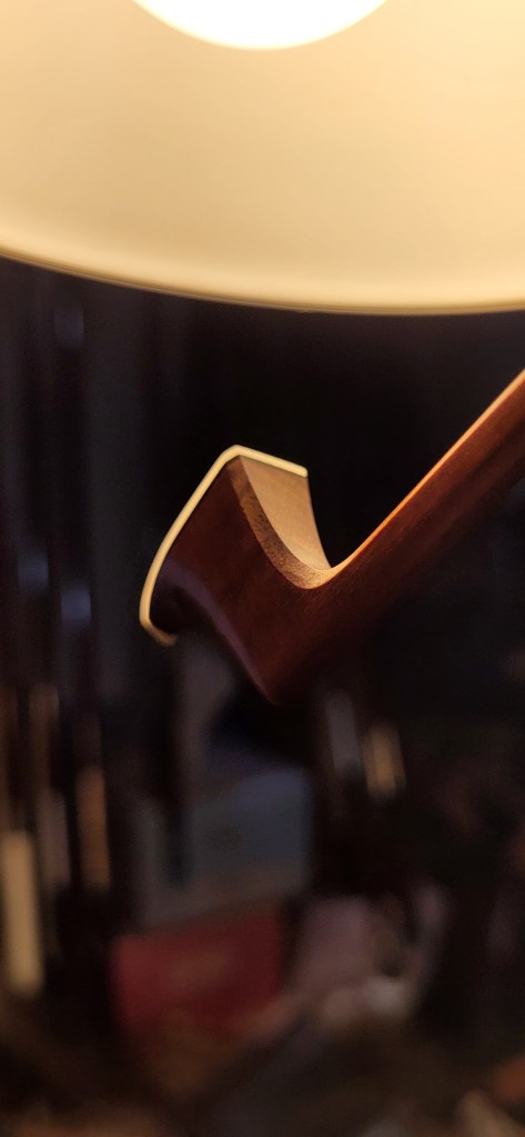 最明顯的倒角就是在弓頭的位置,我對脖子,弓頭倒角的想像。是中古世紀的義大利廊道拱形面的銜接變化。依照整體性,脖子的線條,做出上窄下寬的倒角,不是一昧只要做出一樣的樣子,就是美。